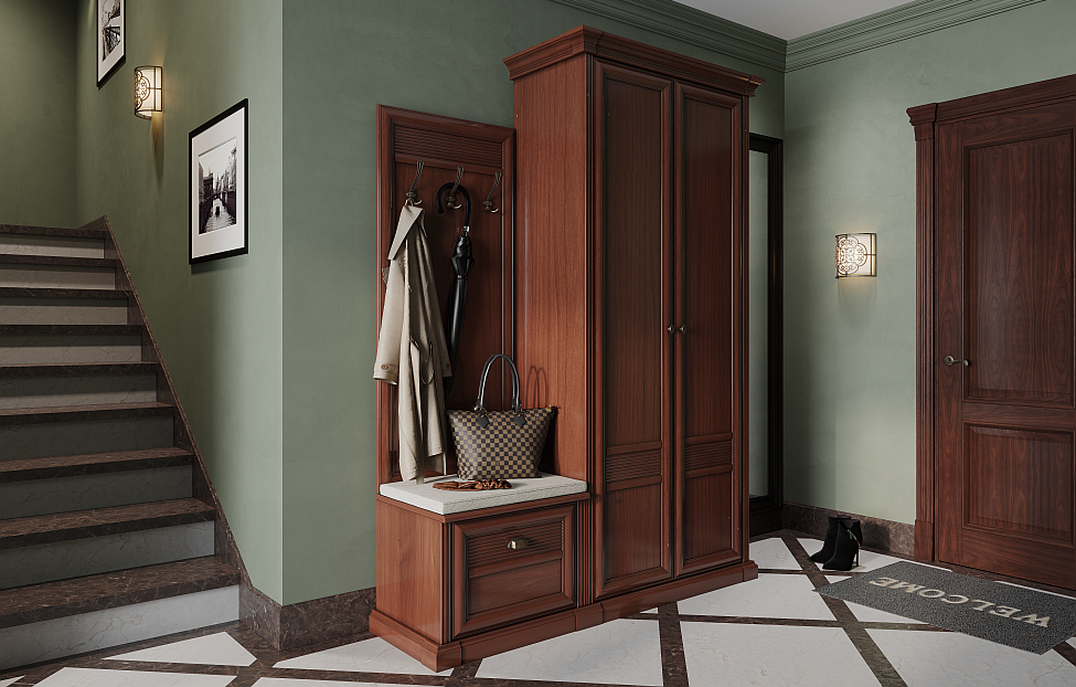 Прихожая Изотта меня устроило по цене и качеству. Смотрится солидно, потому что изготовлена из натурального дерева. В тумбе для обуви есть одна полка, удобно пользоваться. Обувь всегда храню здесь. В шкафу есть выдвижная штанга для одежды, полок достаточно. Мебель сделана качественно, пользоваться нравится. Все легко регулируется по своему усмотрению.