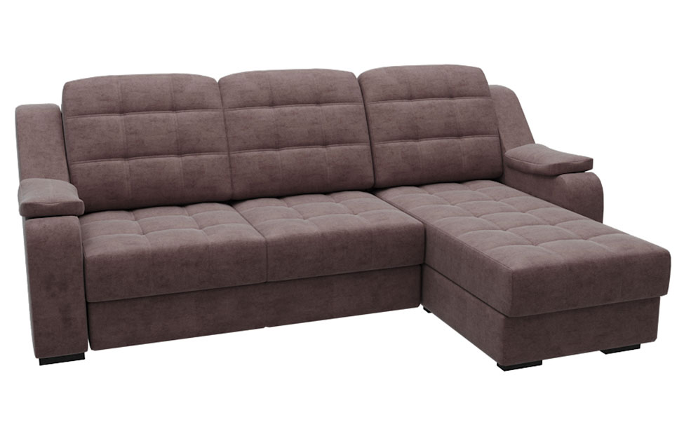 Диван Базель с правой оттоманкой коричневого цвета украсит современный интерьер гостиной. Классический дизайн может быть дополнен яркими акцентами по желанию владельцев. Угловая модель состоит из деревянной основы и плотного наполнителя. Обивка выполнена с помощью велюра — приятной на ощупь и устойчивой к истиранию ткани. Спинка и сиденья декорированы стяжкой, которая придает мебели элегантности. Раскладной механизм «МТД-12» позволяет быстро и легко превратить диван в полноценную кровать.