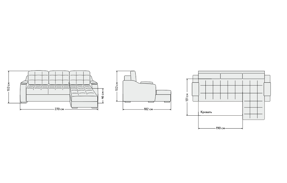 – описание: материал обивки велюр, размер 103x270x182 см, стиль современный, размер спального места 151 х 190 см.