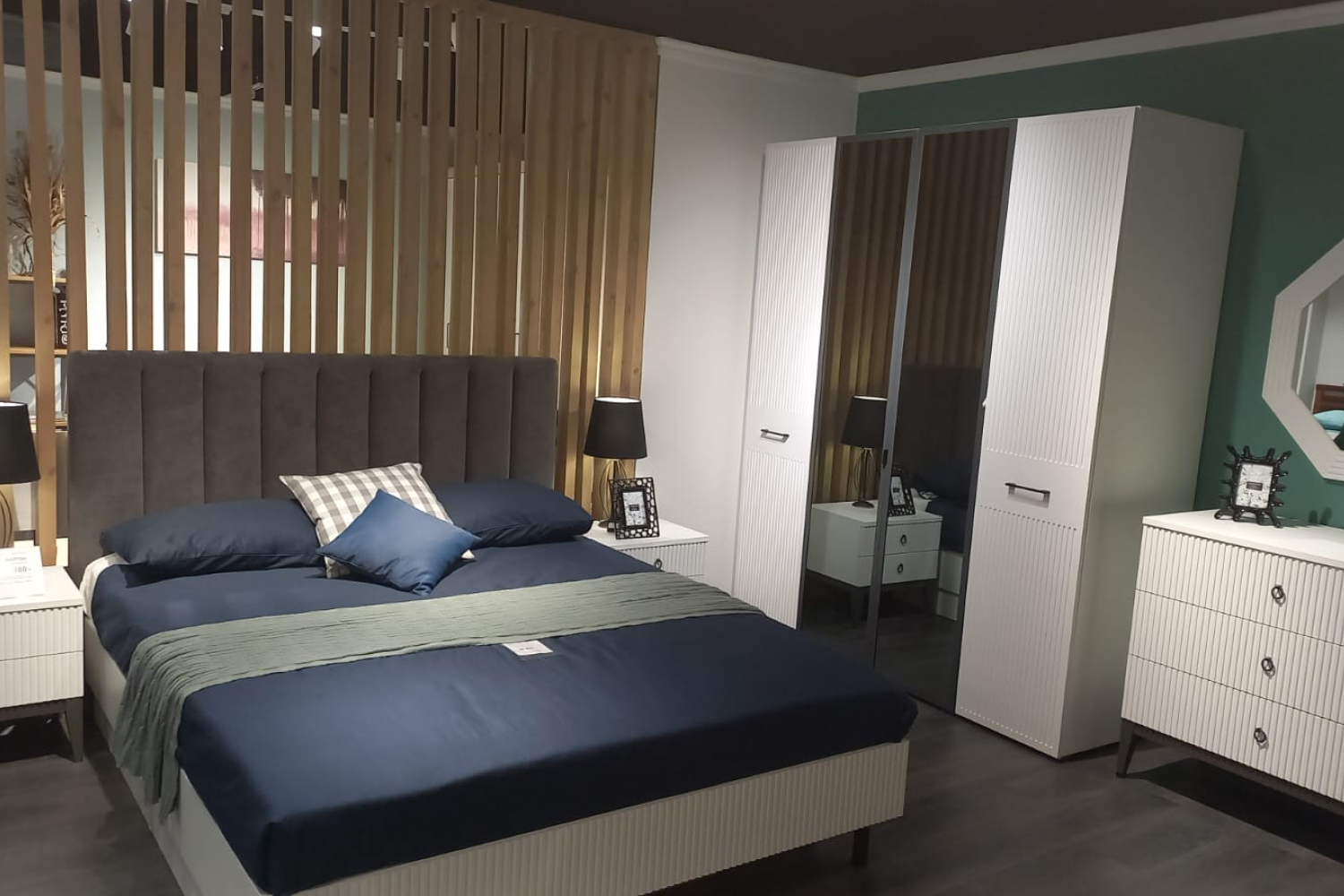 - Для хранения в спальне есть большой шкаф с зеркалом элегантного пепельного оттенка «графит», что придаёт дополнительный шарм коллекции;